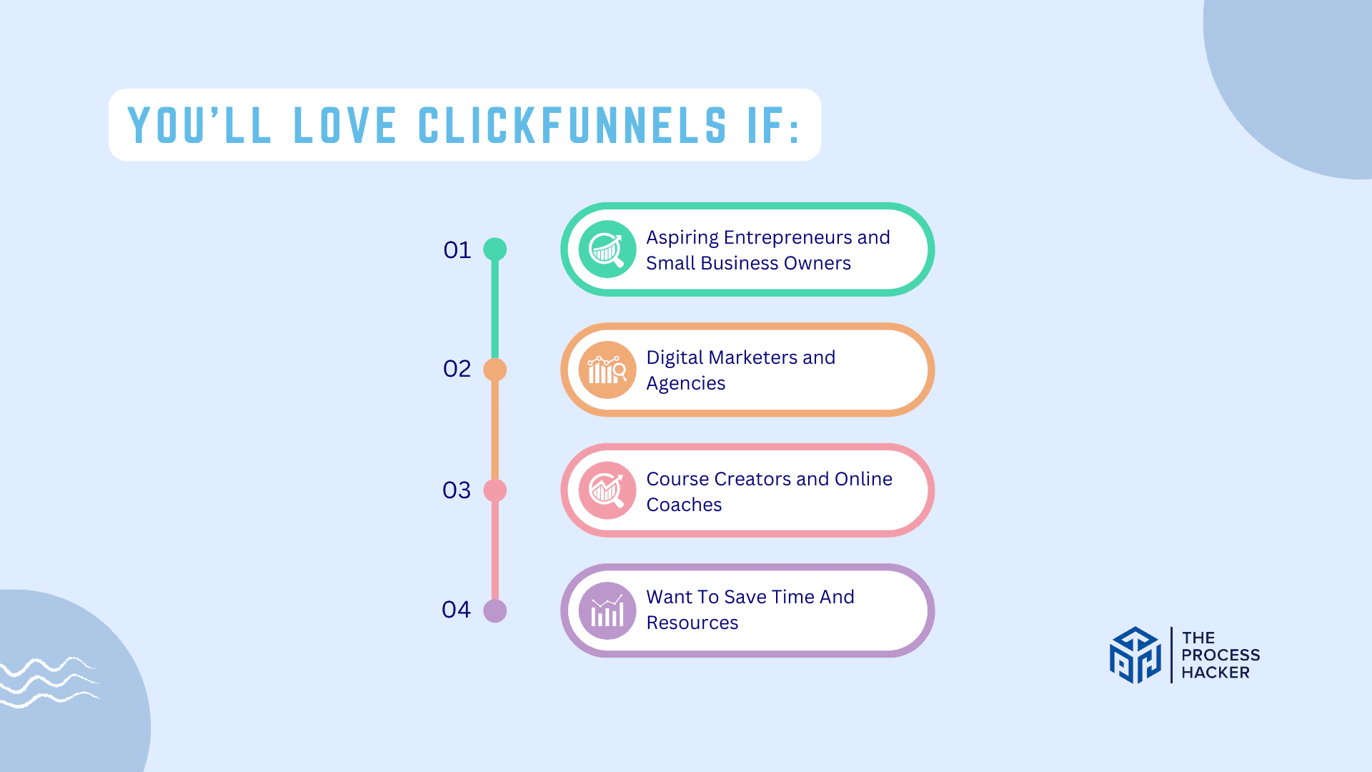 - Aspiring Entrepreneurs and Small Business Owners: If you're eager to establish an online presence and capture leads effectively without needing extensive technical skills, ClickFunnels is your go-to tool. It streamlines marketing and sales processes, making it ideal for those venturing into online entrepreneurship.