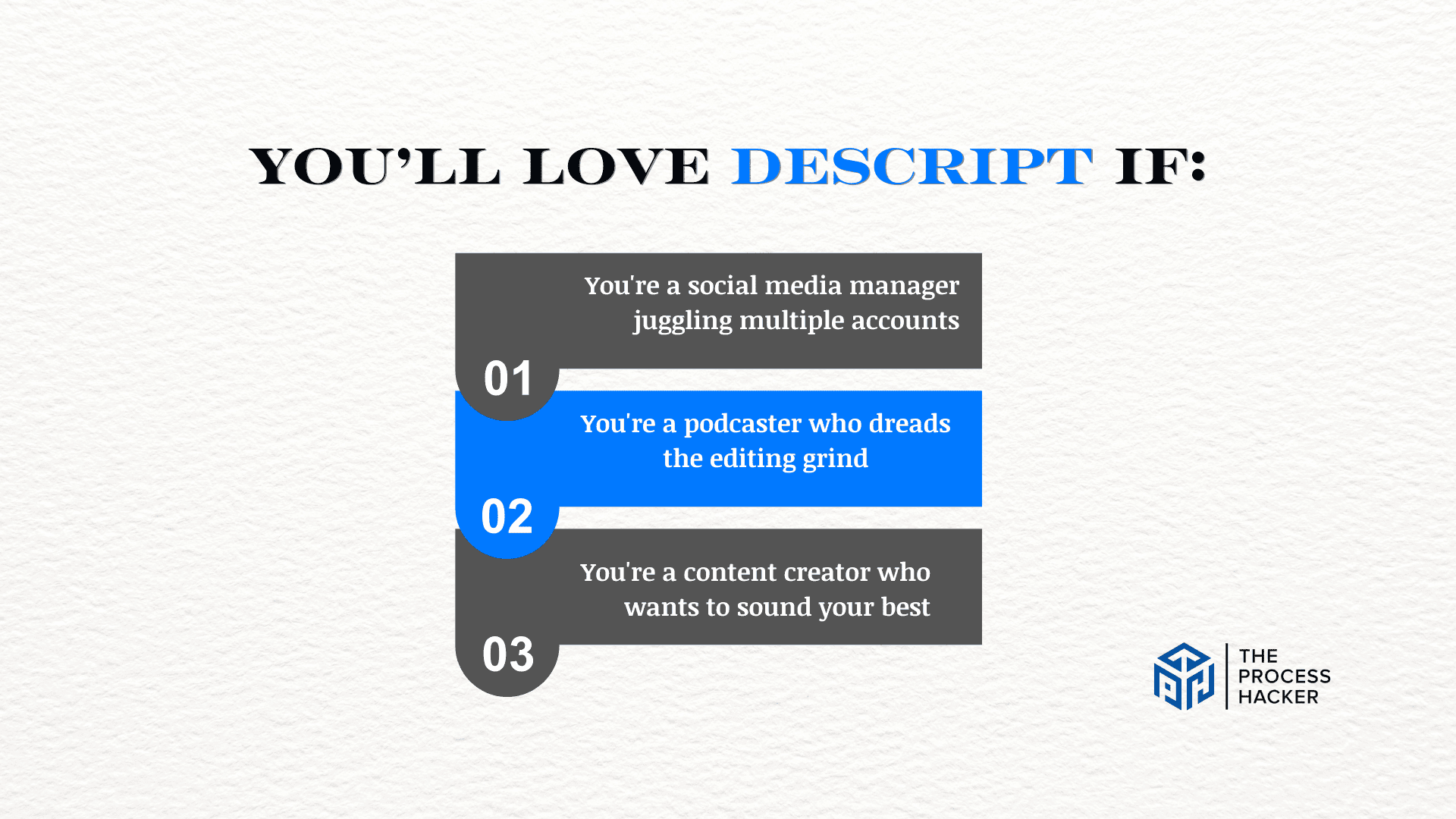 - You're a podcaster who dreads the editing grind: Descript's text-based editing and AI features will save you hours of tedious work so you can focus on creating great content.