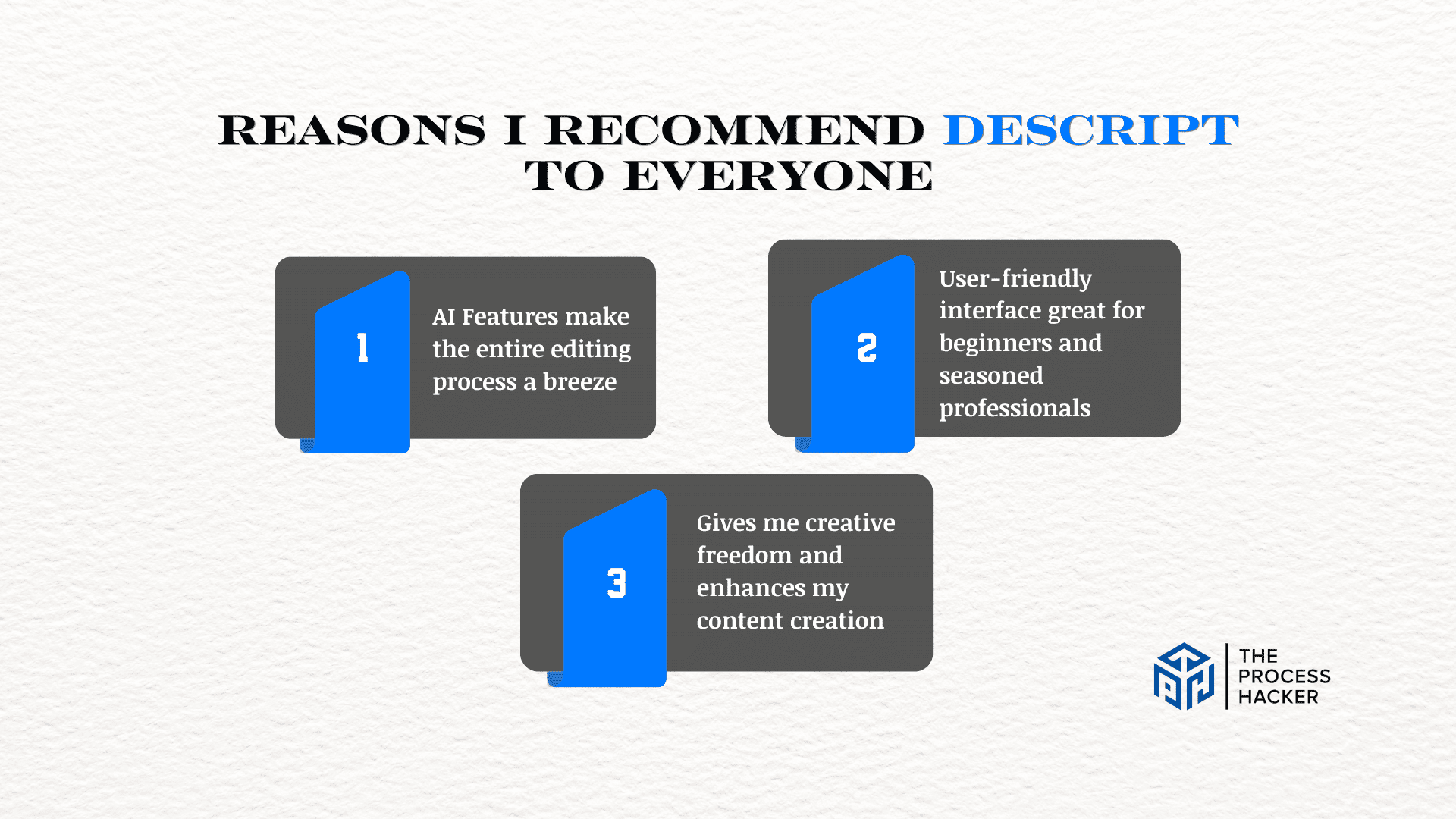 When I first started using Descript, I was impressed by how intuitive and user-friendly the interface was. Even without video editing experience, I could jump in and start creating content. The text-based editing, in particular, feels incredibly natural and makes complex edits a breeze.