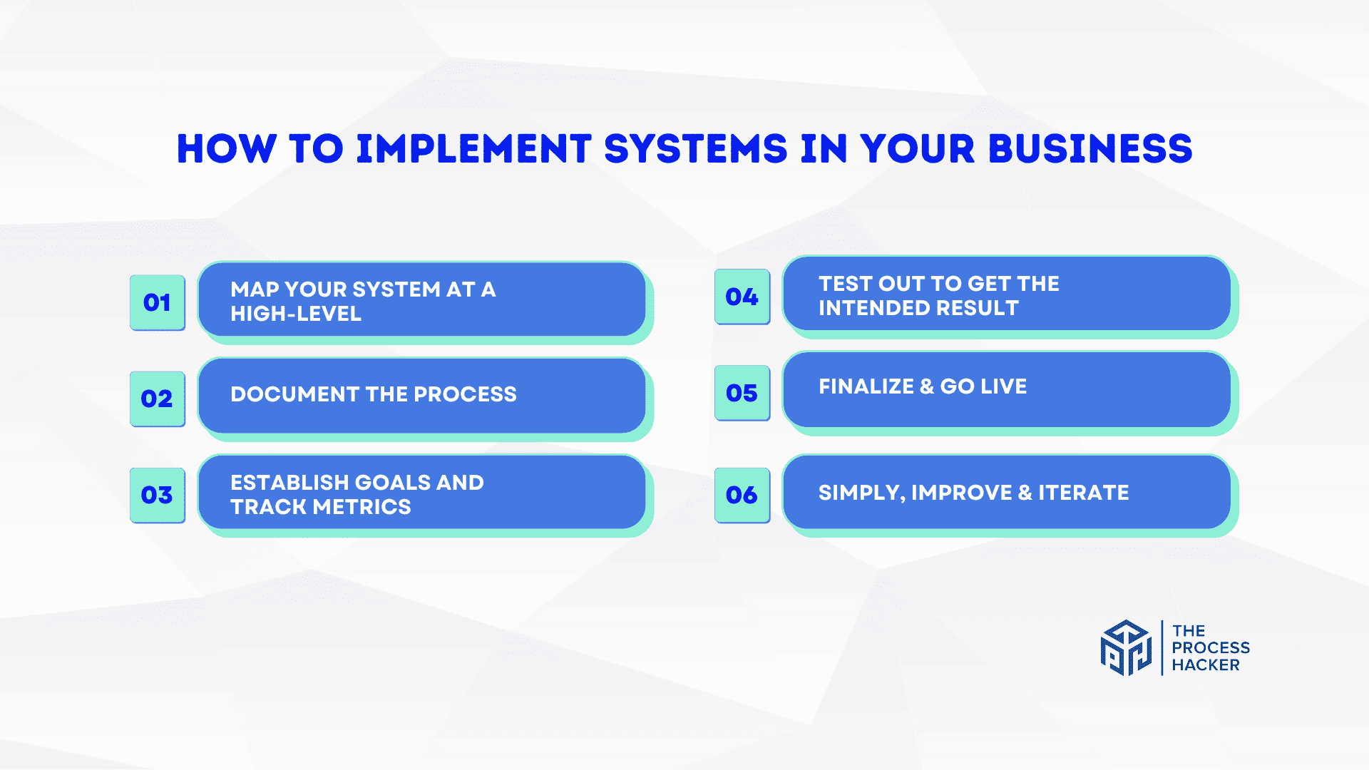 The final step in creating systems in your business is to simplify, improve, and iterate. This ongoing process ensures your systems stay relevant, efficient, and effective.