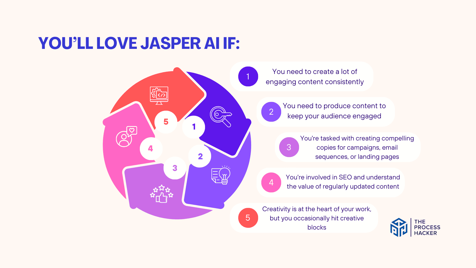 - You cherish the writing process and prefer to craft each sentence painstakingly. If you're not open to AI collaboration in your creative process, Jasper will feel more like an intrusion than an aid.
