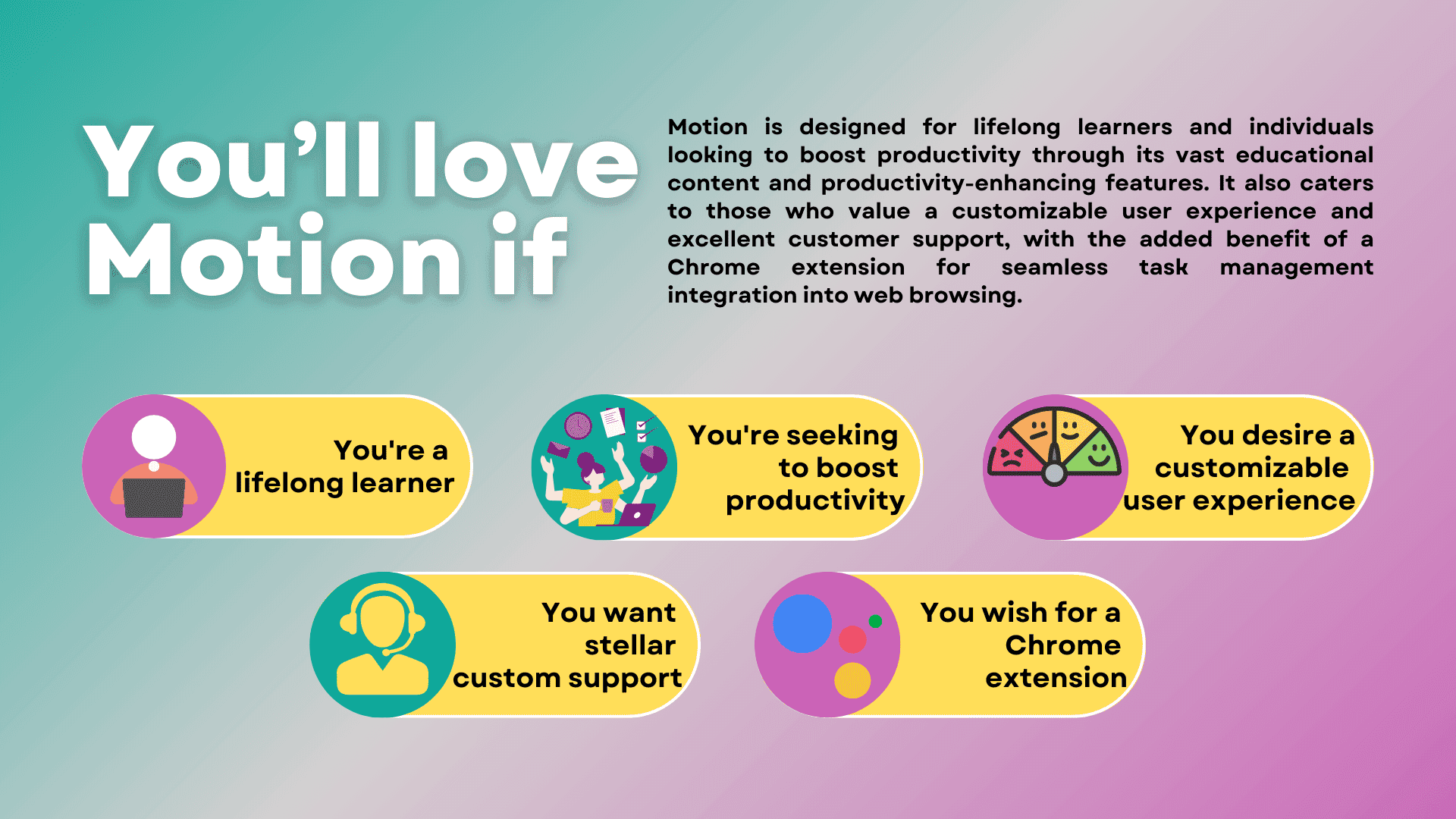- You're a lifelong learner: Motion's vast educational content can provide a rich, diverse learning experience if you enjoy continuous learning and personal development. Whether you're looking to gain new skills or deepen your understanding of specific topics, Motion's resources can help you achieve your learning goals.