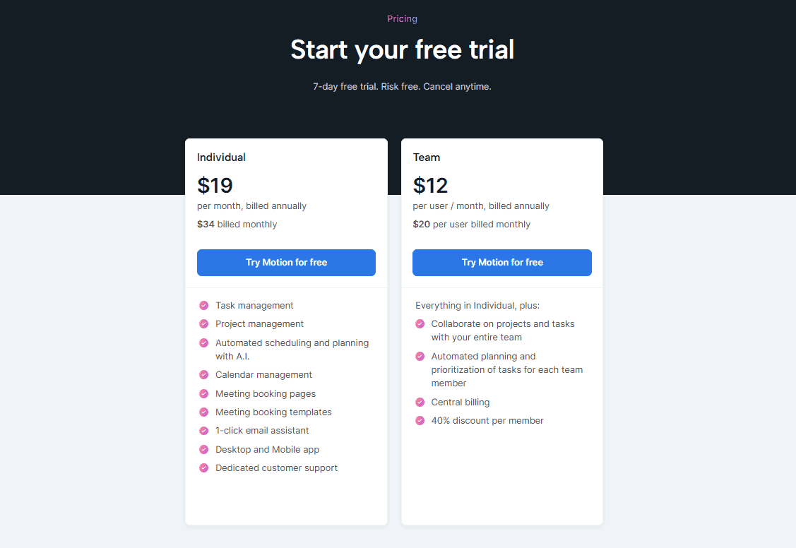 Motion offers a variety of pricing plans to cater to the diverse needs of its users. They are available in annual and monthly plans. For individual users, the cost is typically $19 per month billed yearly or $34 per month if billed monthly.