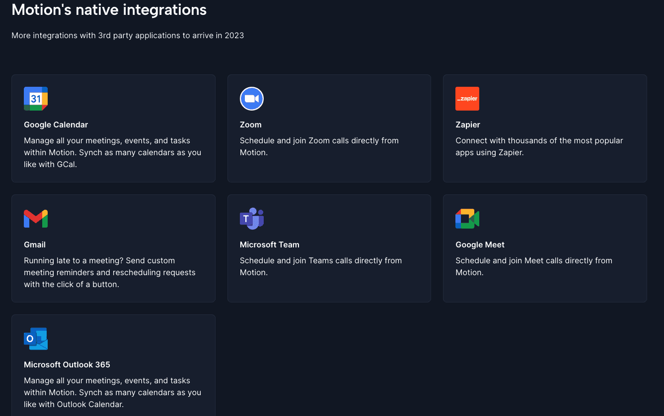 Compared to similar Motion apps, it does not have that many native integrations. The company states that more integrations with 3rd party applications will arrive in 2023. Here is a list of the integrations currently supported by the Motion app.