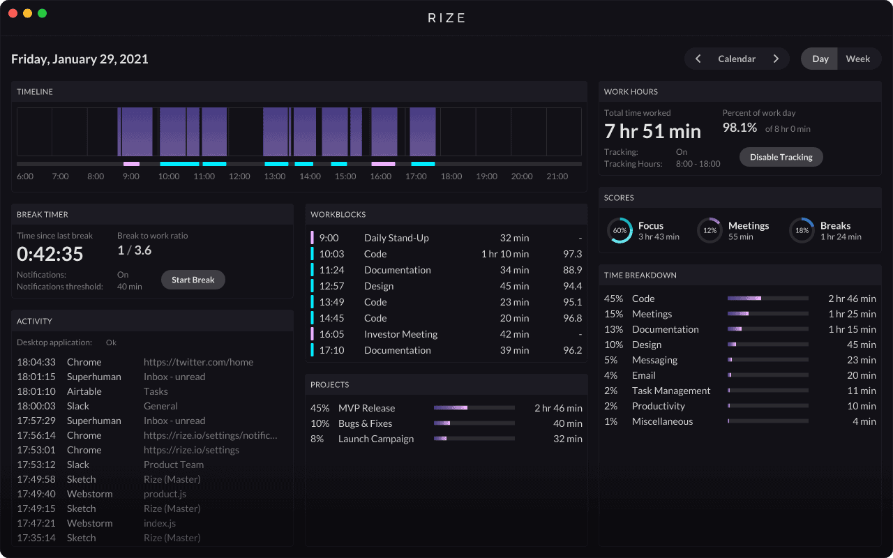 Rize is an app that tracks and categorizes your work activity in real-time on macOS and Windows. It helps you understand how you spend your time, improve your focus by providing daily scores and personalized metrics, and build better work habits by notifying you when to take a break at the right time.