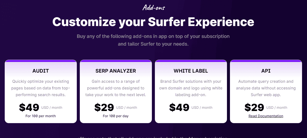 Additionally, it offers add-ons that can be purchased on top of the subscription. These include Audit, SERP Analyzer, Whitelabel, and Surfer API.
