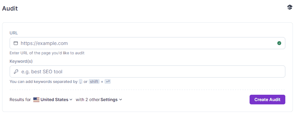 The SEO Audit feature comprehensively analyzes your website's SEO performance.