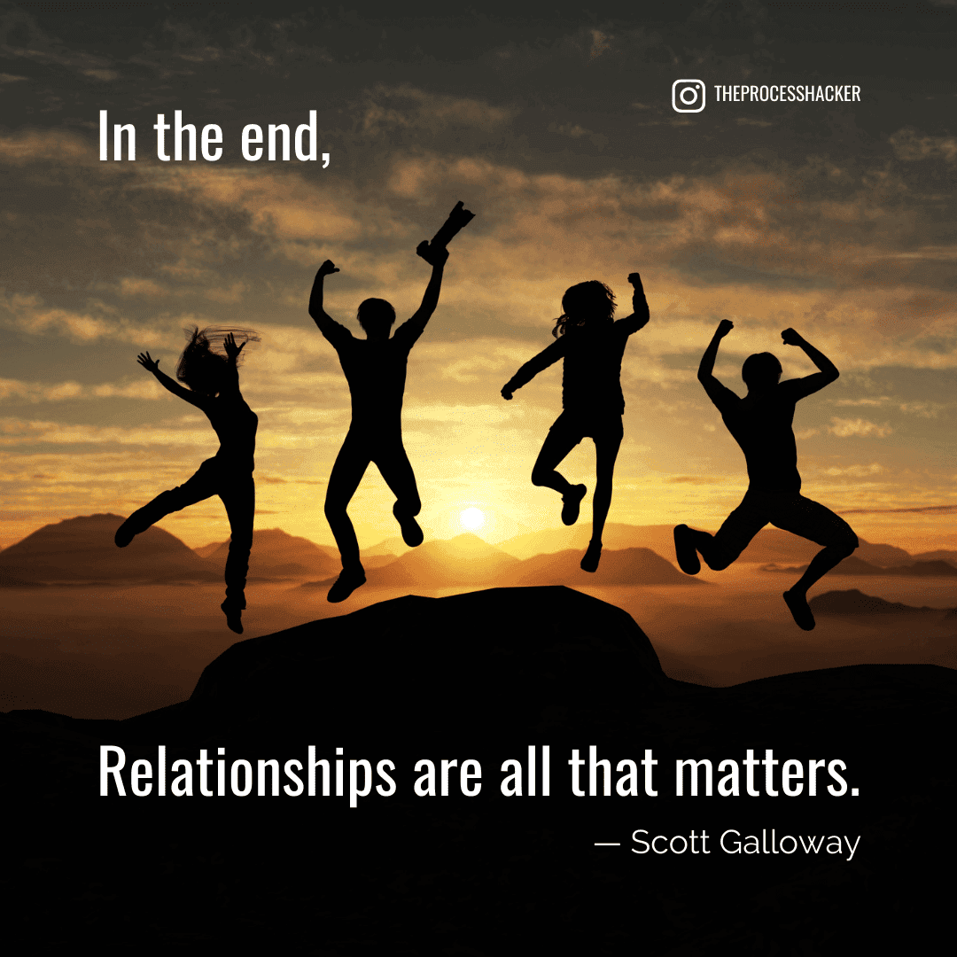 Scott Galloway concludes The Algebra of Happiness by saying that even he has become addicted to the affirmation and wealth of being successful professionally. However, when he looks at the stuff he inherited from his mom's best friend, he feels the need to invest in relationships. When you are left with nothing, relationships will be all that you have. "In the end, relationships are all that matters."