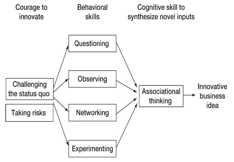 Innovators gain the courage to innovate to change the status quo and take intelligent risks to bring about that change. As shown in this diagram, innovators get motivated to use their behavioral skills, which trigger the cognitive associating skill to synthesize novel inputs: